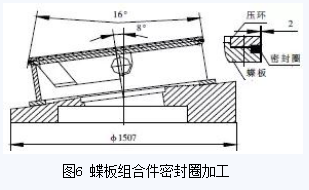 蝶板组合件起密封作用的零件是密封圈,密封圈为斜锥结构,其锥顶角为16°,厚度为13.5mm,由5层石棉板及4层不锈钢板复合而成(图6)。密封圈必须与蝶板和压环等组装在一起,加工时才能防止密封圈夹层中的不锈钢板及石棉板翘曲变形。根据其结构特点,对蝶板组合件密封圈采用以下加工方法:(1)先在2.5m立车上分别把蝶板和压环上的各止口加工到图纸要求尺寸,外圆不加工;(2)按图纸要求对压环钻孔,蝶板钻孔攻丝;(3)压环、密封圈和蝶板按图纸装配,将蝶板组合件工装用螺栓紧固在阀体工装上,然后再将蝶板组合件装夹其上。立车刀杆旋转8°车压环、密封圈和蝶板至磨削尺寸;⑷用同样厚度钢板替下密封圈,车压环、蝶板各锥面至图纸尺寸;(5)工装不动,将压环、密封圈、蝶板重新按要求组装,然后在立车刀架上装磨头,对密封圈进行磨削处理,使其达到图纸设计粗糙度要求。