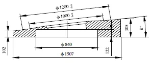 9332彩票网 阀体起密封作为的为密封圈,焊接在阀体内(图5)。在2.5m立车上将组焊好的阀体装夹在阀体密封圈加工工装上,将立车刀杆旋转8°,根据图纸设计要求,找正后沿圆锥母线方向走刀,车至未焊不锈钢前的尺寸。然后堆焊不锈钢,最后将焊好不锈钢的阀体重新上立车,按上述方法车阀体密封圈至图纸要求尺寸。最后在立车刀架上装磨头,对阀体密封圈进行磨削处理,使其达到图纸设计粗糙度要求。