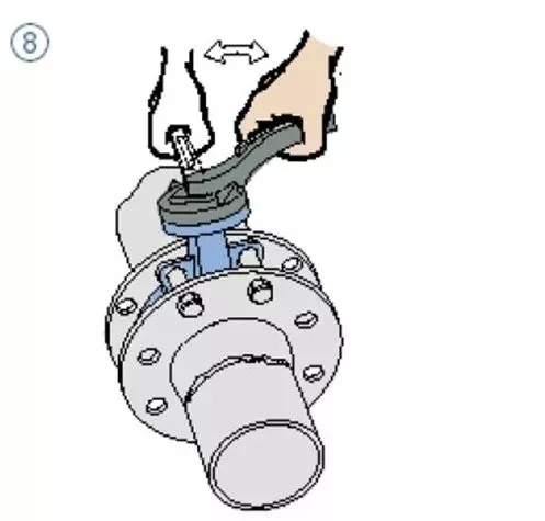 7、蝶阀法兰盘在安装时必须确保法兰面和密封橡胶对中,螺钉均匀拧紧,密封面必须贴合完整;如果出现螺钉拧紧力度不均匀会出现橡胶凸起卡住蝶板,或顶住蝶板造成阀杆处泄漏。